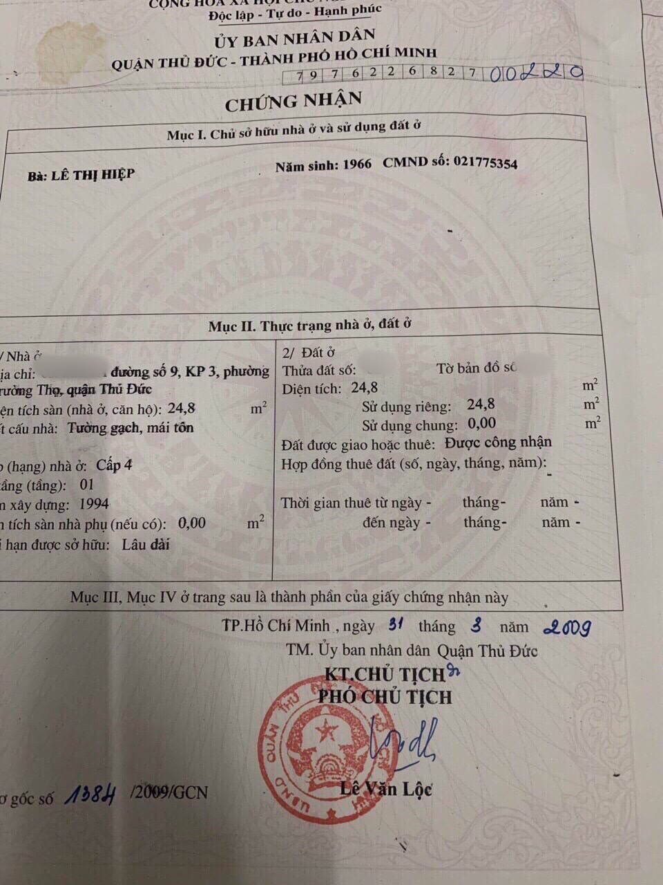 Địa chỉ tài sản: Đường số 9, Phường Trường Thọ, Quận Thủ Đức, Hồ Chí Minh